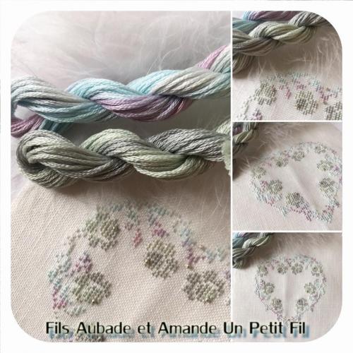 Sur cette broderie, le fil Aubade dessine le tour du coeur, les roses sont brodées avec le fil Amande