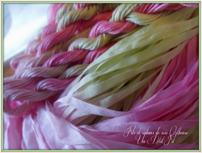 Ce fil de soie teinté main dans la même gamme que les fils moulinés rubans de soie et dentelles Orthense.....